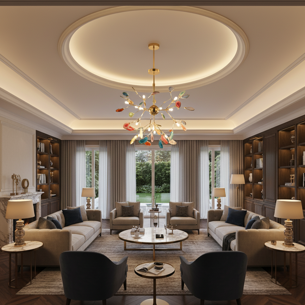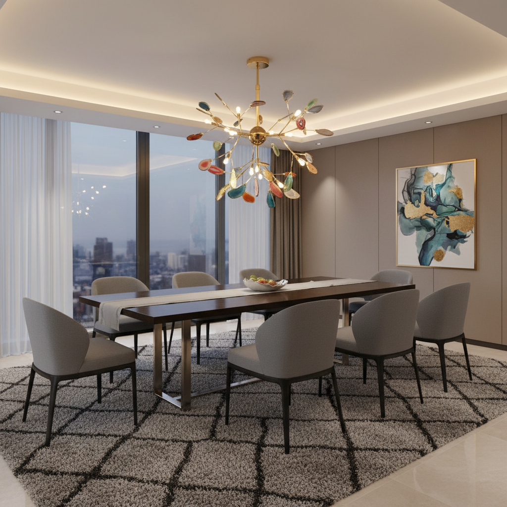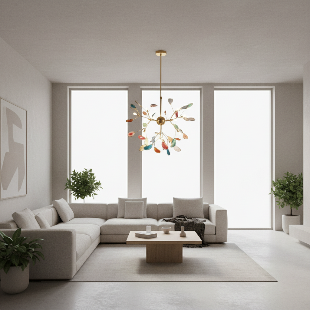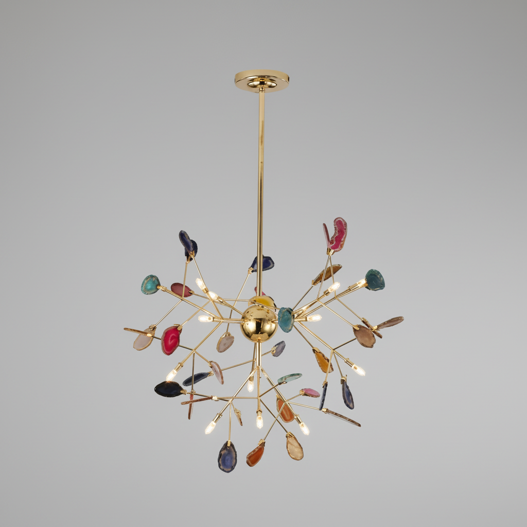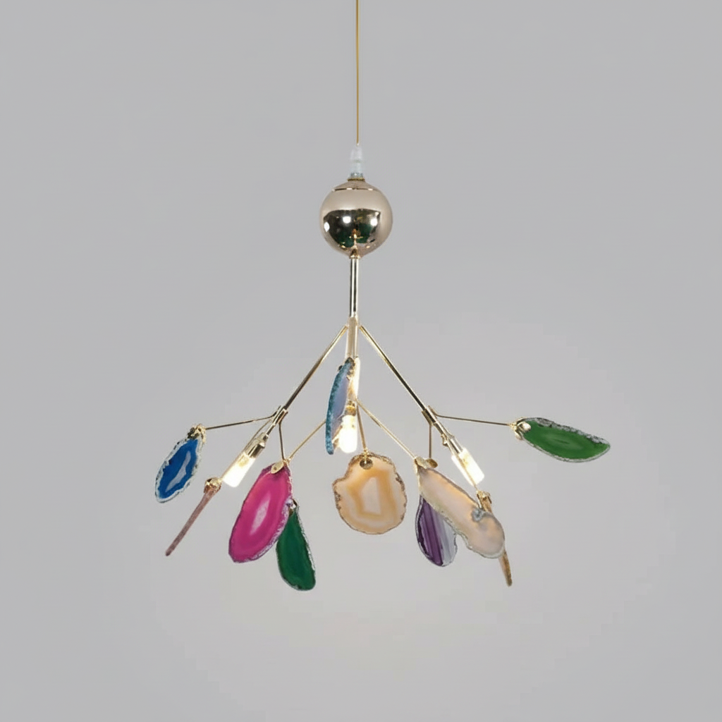 This exquisite modern Nordic chandelier features natural agate stones, each uniquely colored and shaped, adding a touch of luxury to any contemporary space. Its intricate design and vibrant hues create an eye-catching centerpiece that enhances the elegance of your home. Perfect for various settings, this chandelier seamlessly blends modern aesthetics with Nordic charm.